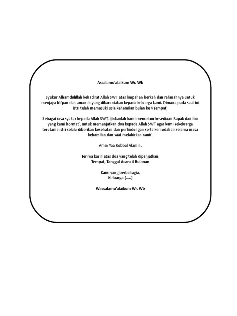 Format undangan 4 bulanan kehamilan doc. Cari harga dan promo terbaik untuk kartu ucapan 4 bulanan kehamilan diantara 54 produk. Berikut adalah contoh inspirasi desain kartu ucapan tasyakuran 4 bulanan kehamilan disertai dengan format psd agar bisa diedit dan disesuaikan dengan . Jual terpercaya kartu ucapan tasyakuran kehamilan 4 bulanan free desain. Contoh undangan tasyakuran 4 bulan usia kehamilan buat .